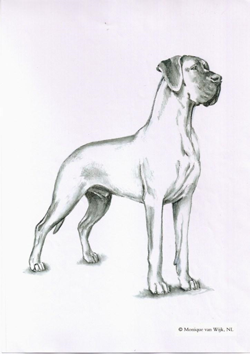 Очень выразительной головой, мощным развитием костяка и мускулатуры в сочетании с благородством осанки, гармоничностью строения, четким и пропорциональным контуром тела дог производит впечатление благородной статуи. Никогда не грубый или слишком элегантный. Половой диморфизм хорошо выражен. Он — Аполлон среди пород собак.